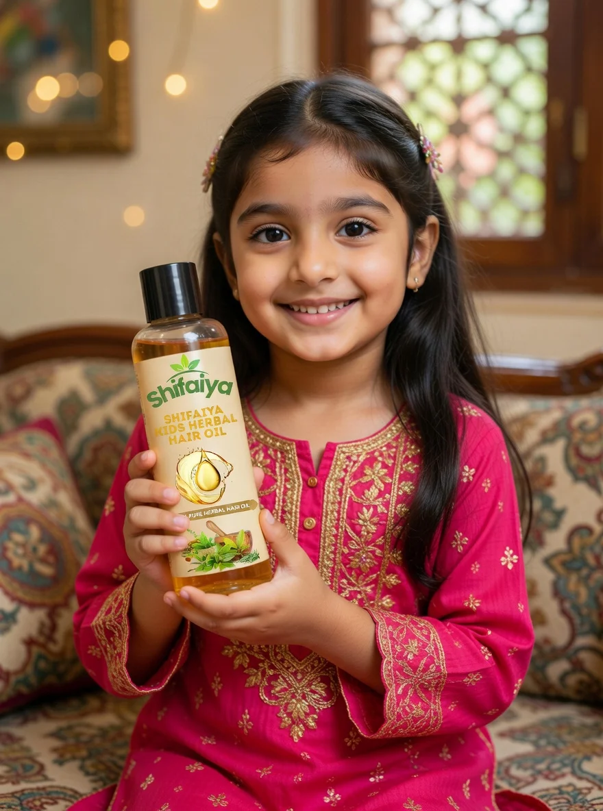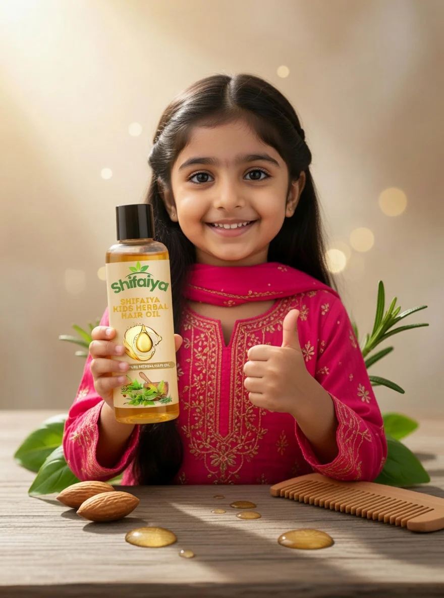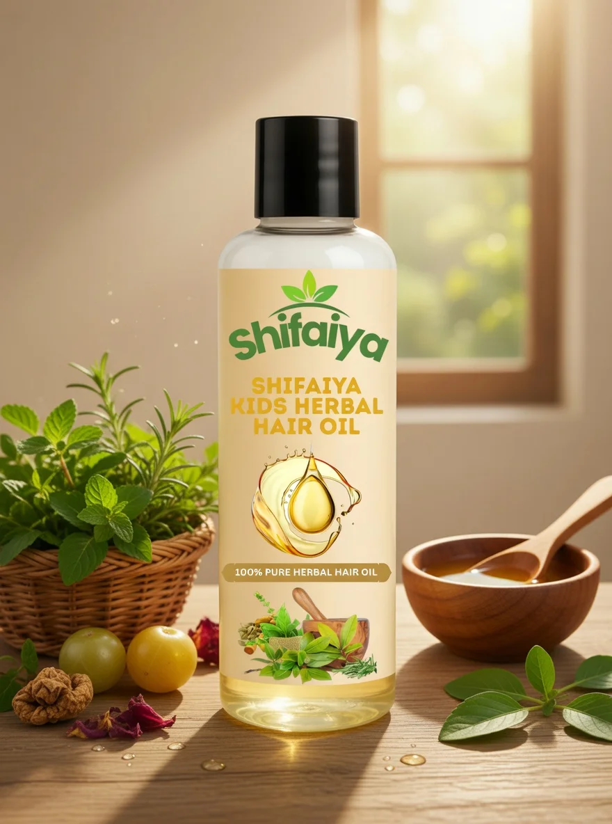 Shifaiya Kids Herbal Hair Oil is a 100% natural herbal oil specially designed for children aged 5 to 18 years. It helps nourish the scalp, strengthen hair roots, and support healthy, strong, and shiny hair growth.